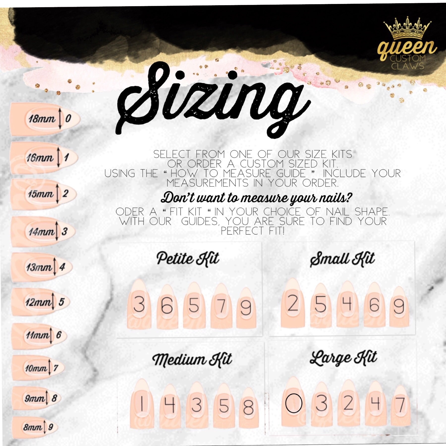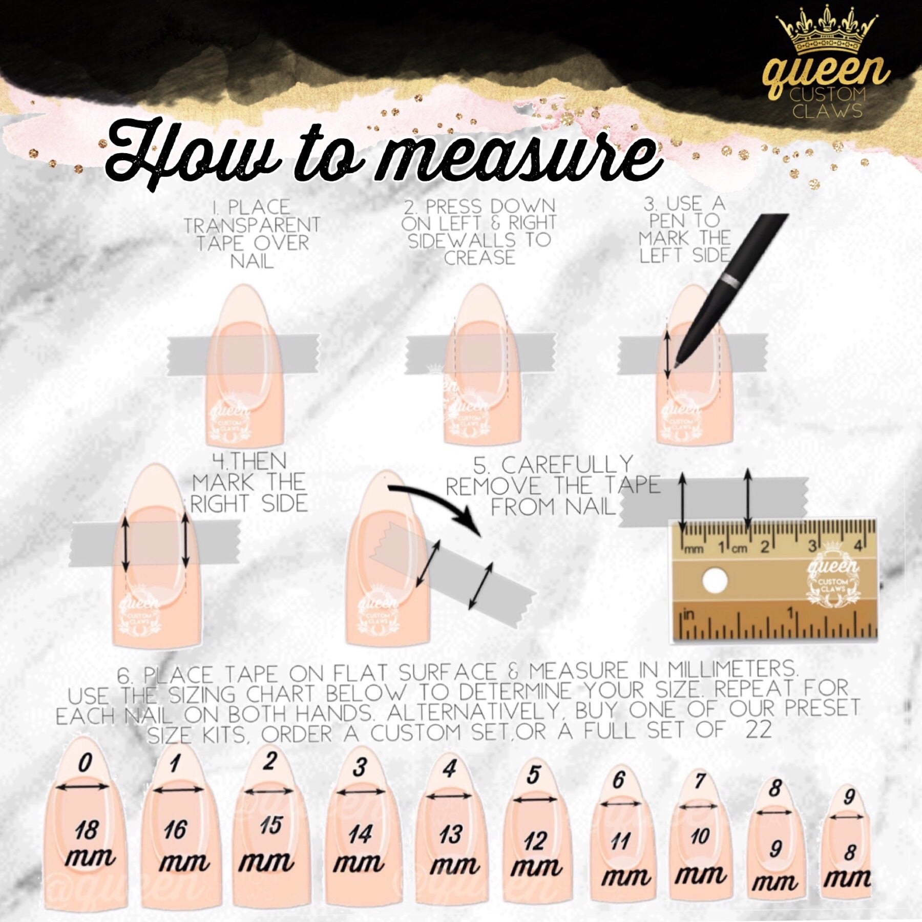 If you have any questions or require further assistance with sizing, please do not hesitate to contact me. IÂ am here to help and ensure that you find the perfect fit for your nail products. Thank you for choosing Queen Custom Claws for your nail care needs.