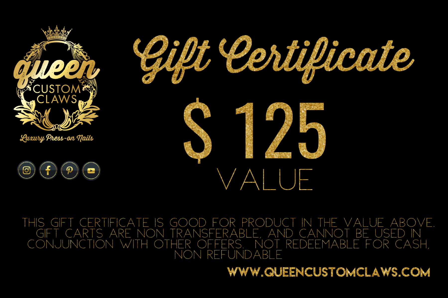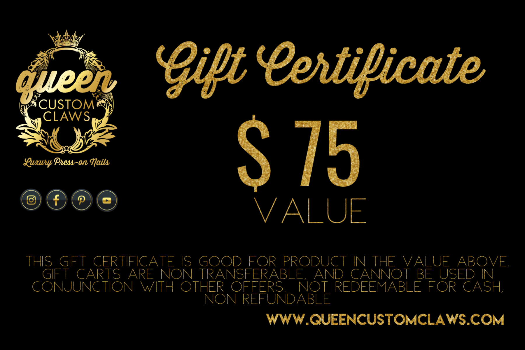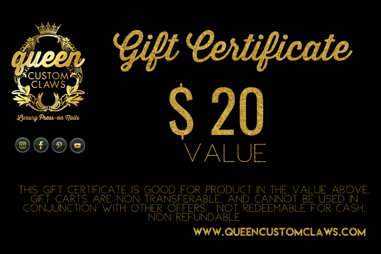 Pamper your loved one with a gift certificate from Queen Custom Claws. Clients will be personally assisted with the one on one designer service I offer all my clients. You will receive an email with the Shopify generated gift card # to the email address you enter. If you would like a custom graphic personalized with the recipients name & message- Simply leave your to: from: and personal message info in the custom notes section of this listing. You will receive a beautiful E gift card RECEIPT designed just for you.