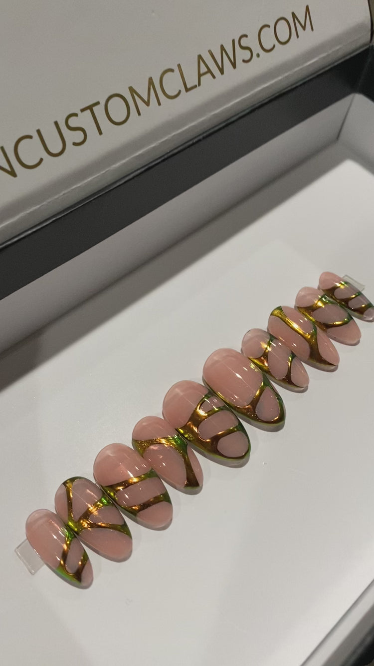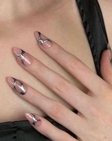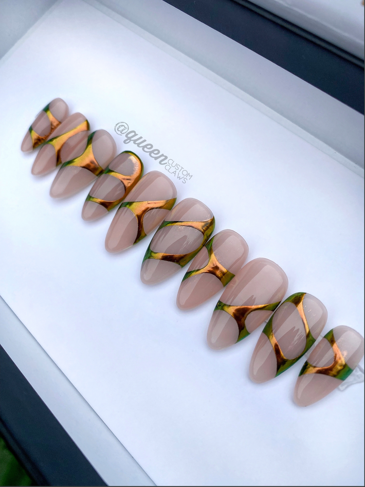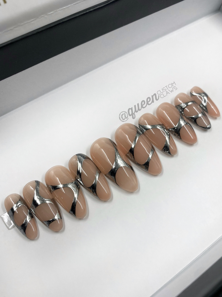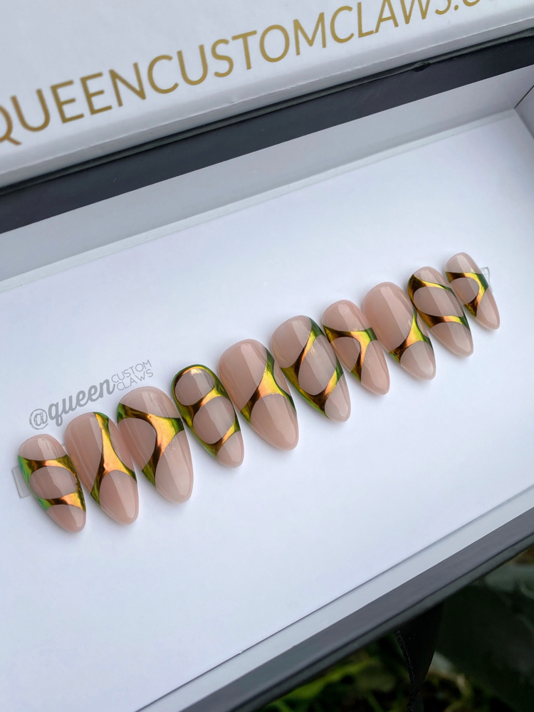 Alien, because of the unique design and otherworldly, dual chrome or chrome shades. The negative space modernizes the French tip classic for an edgy alternative. Your choice of tip and base color. I offer more chromes than pictured here. Sample set pictured in a duo chrome.