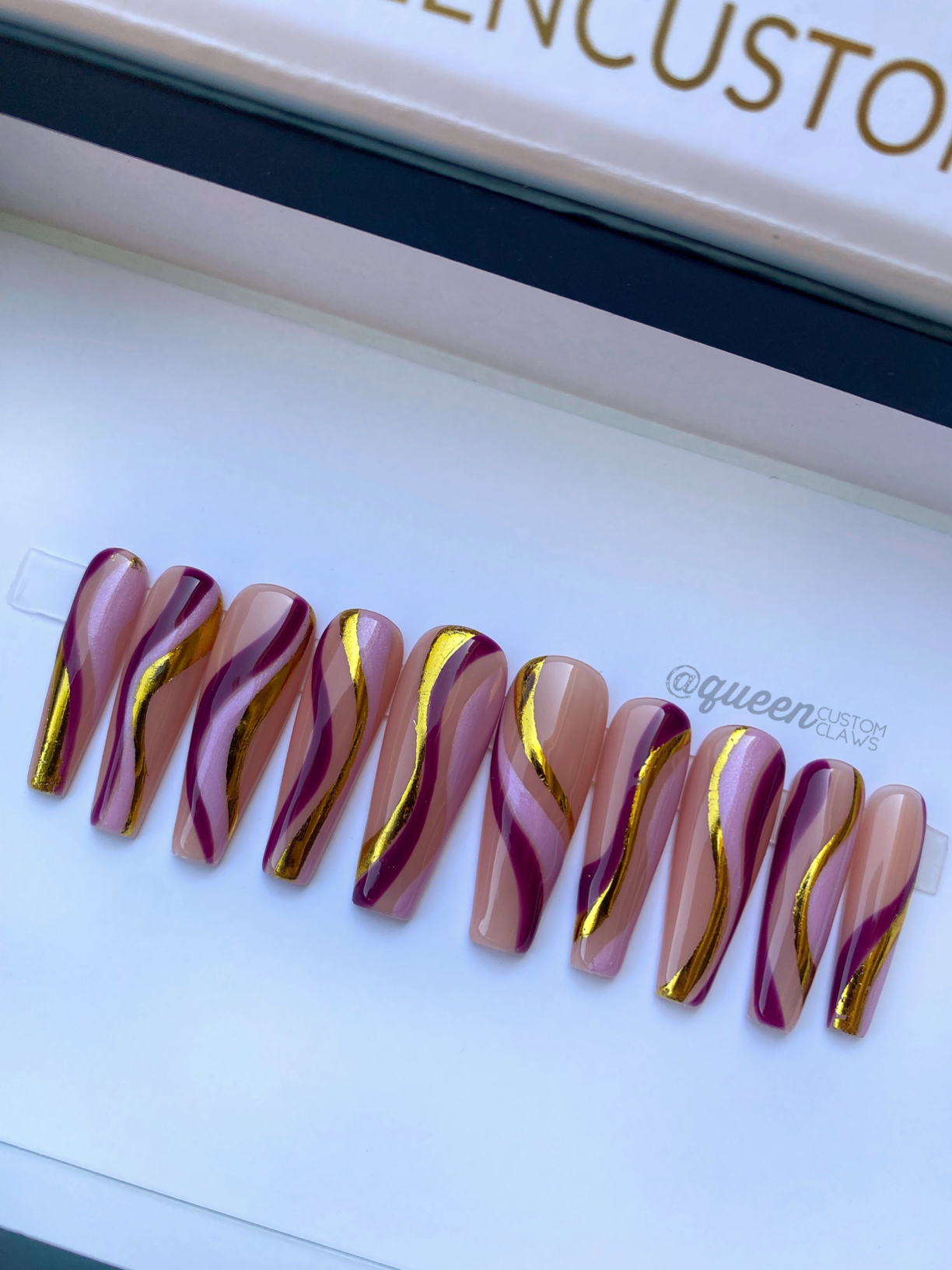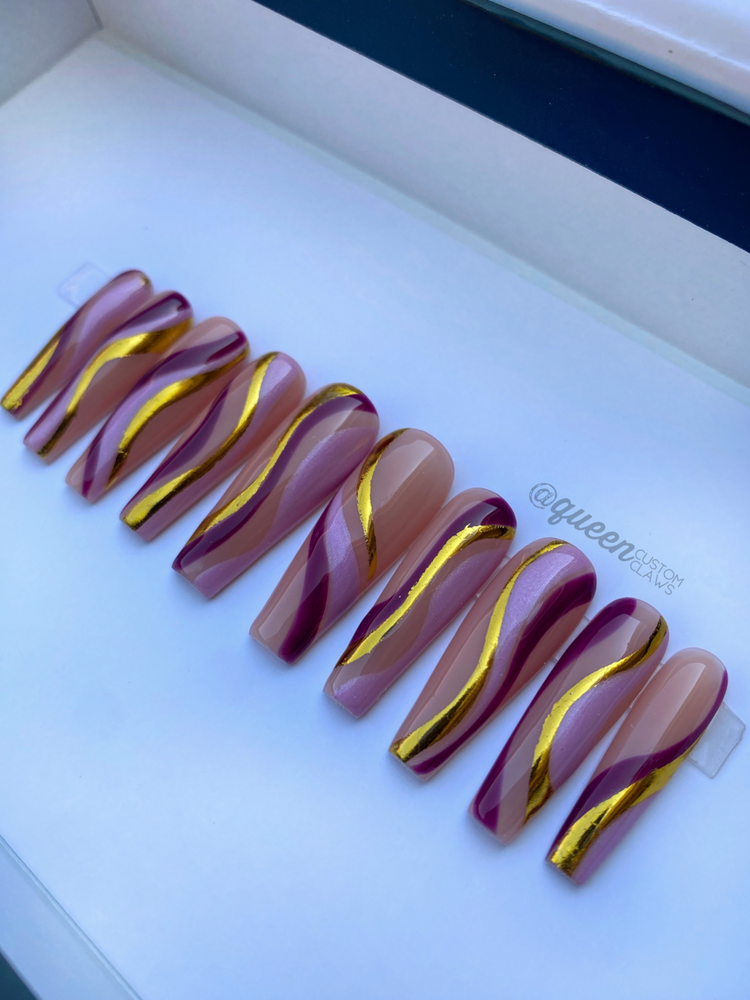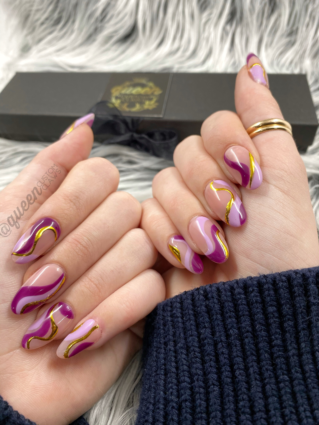 Swerve detail modified French manicure with negative space and curve squiggly lines over subtle sheer jelly body and gold accents. Opacity will vary based on color selection. Requesting color change for the 2 purples if you’ll like. Message with questions or consult.