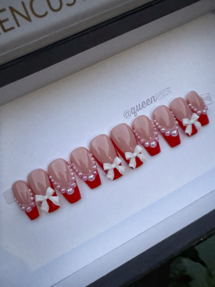 Enhance your elegance with Valentina: pearl french tip press-on nails. The delicate pearl studded smile line and accent bows add a touch of luxury to the classic French tip design. Choose your base and nail color, along with white or pink pearls, to create a customized and sophisticated look.