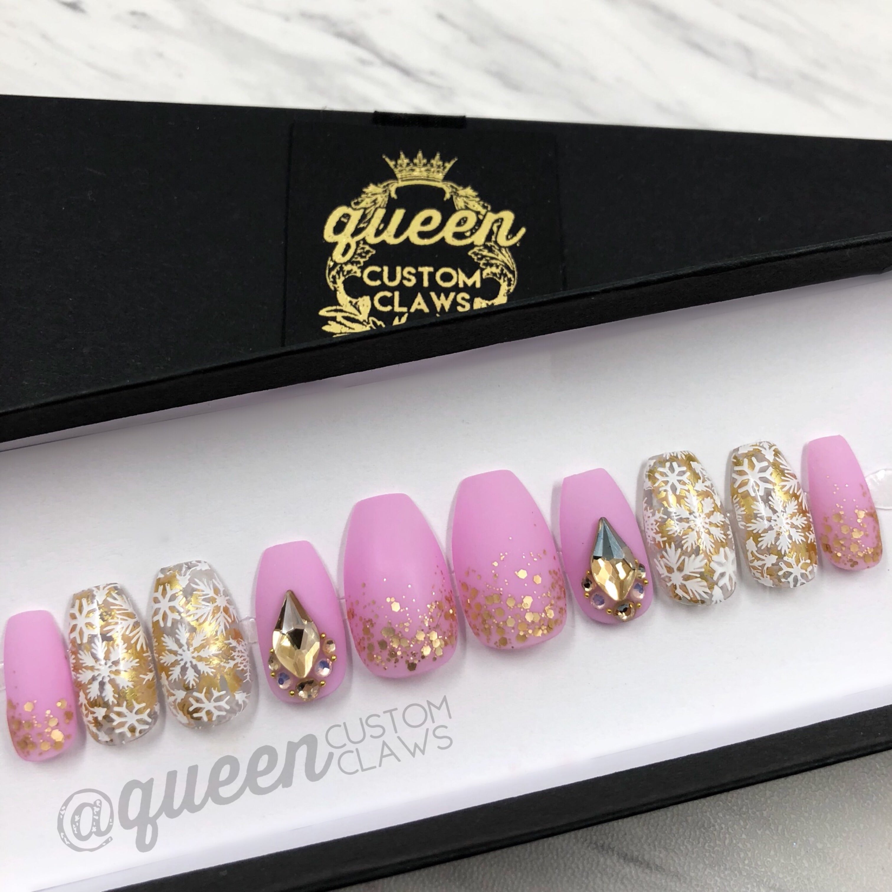 Matte pink nails, with champagne gem accents to match the frosty snowflake gold foil accent nails