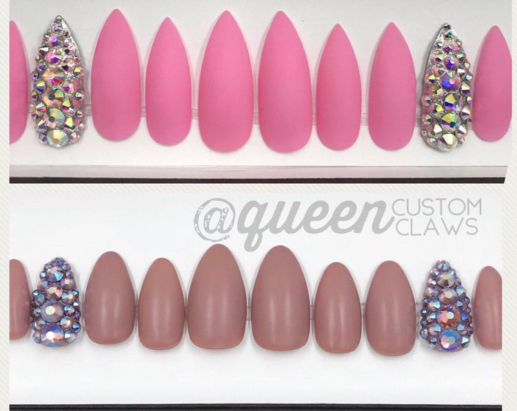 Matté finish juxtaposed against the sparkly AB crystals- a beautiful contradiction which making this set interesting and special. Pick any color , done in a matte finish. Pink AB bling nails