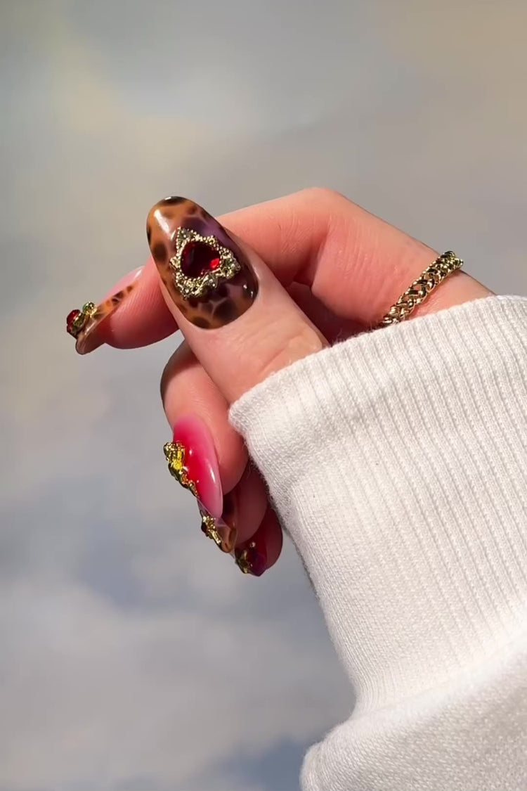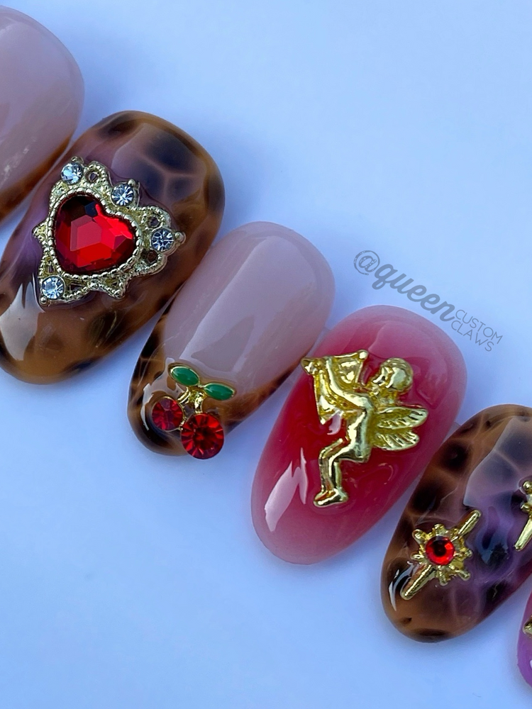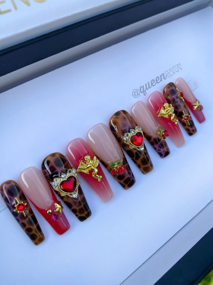 Get fierce and flirty with our Cheetah Bomb Bling press on nails. The bold cheetah print and vibrant red and purple airbrush design add a touch of sass, while the nail charms provide a unique and playful touch. Perfect for making a statement on Valentine's Day or any day!