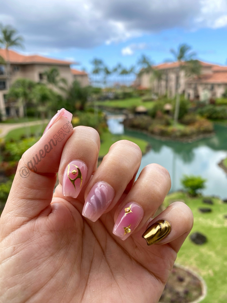 The rock and pop star set but in nude & pink colors . Aurora ombré and 3D blob designs with chrome stars and bezels. This nude colored star look is available in any length or most color combo of your choice. Also pictured in green (pop star) and black (rockstar) but really can be created in a variety of chrome and polish colors. Message me to design your custom set- or simply leave your preferences in the custom comments portion of your order.