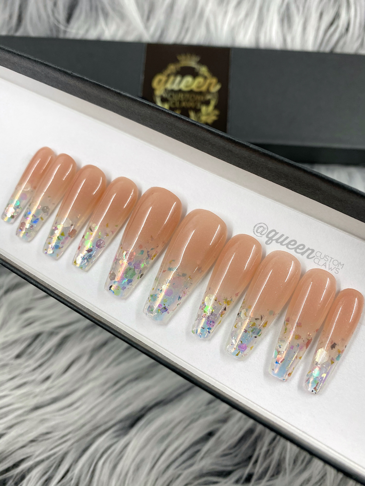 Bring sparkle to the party with these Funfetti nails. Featuring iridescent chunky glitter French tips, they'll take your mani game to the next level. No matter the occasion, you'll be ready to sparkle! This set is technique driven with large chunk glitter encapsulated in gel tips. Filed and buffed, the base of the nail is concealed under a beautiful base ombré cover nude/pink with a hint of shimmer- for even the shortest nail beds.