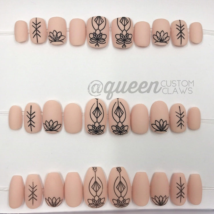 Beautiful neutral, done in a matte finish with black minimalistic stamping make these nails unique and artful.