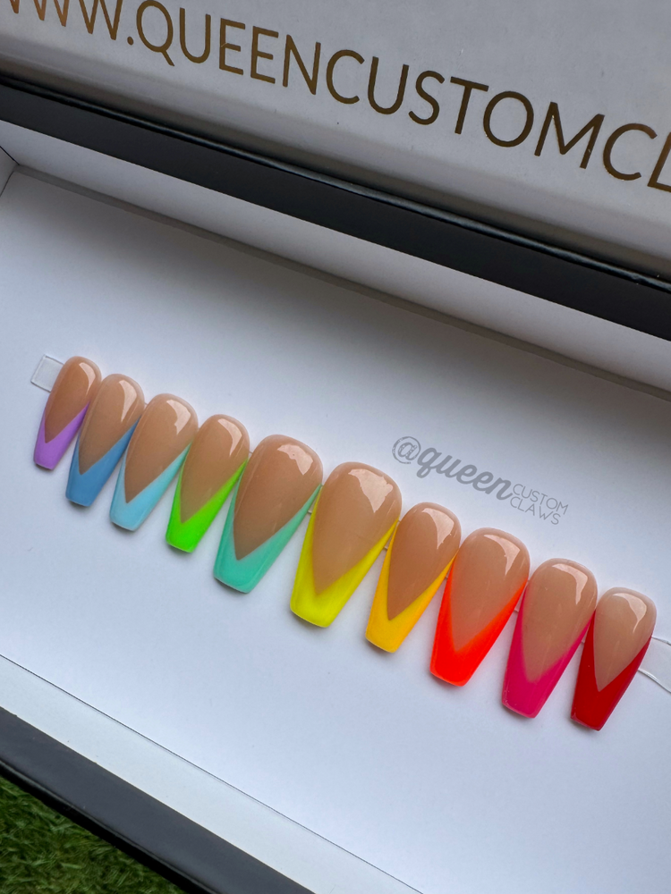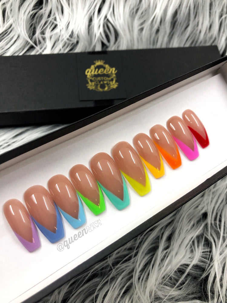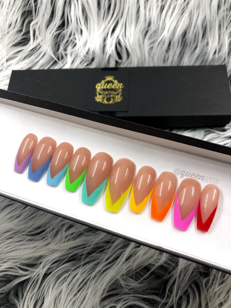 V French is a modern twist to the classic French manicure. this Remix design is the perfect way to get the french tip look, while still having a colorful manicure. Base color is subtly sheer, giving the nail that authentic acrylic look. If you hope for a different base color- just message me in the note to seller. I have a full array of flesh tones.
