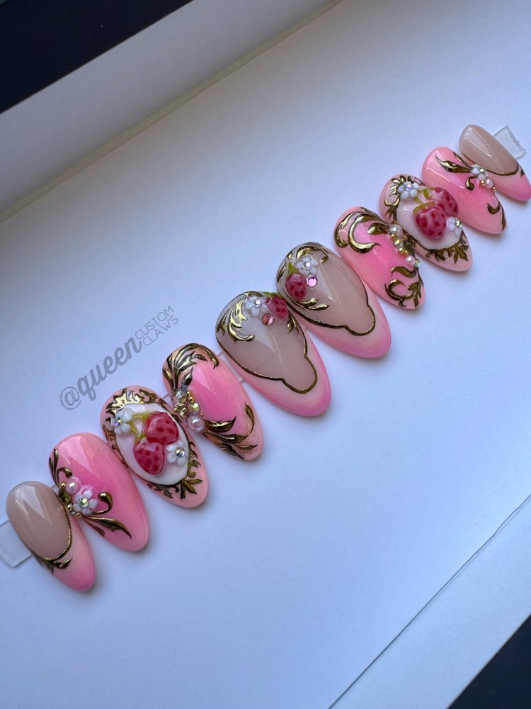 🎀🍓🌸Berry Fancy with Versailles opulence. These strawberry blush nails are adorned with swirling chrome filigree, sculpted 3D strawberries, and sparkling crystals for a look that’s both decadent and irresistibly sweet. Gilded flourishes add a royal touch, making this set pure indulgence—because being extra is always in style