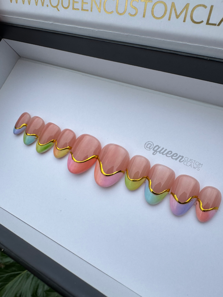 Ombré in a sweet sorbet of colors. This modified French manicure with gold squiggly lines over subtle sheer jelly body and gold star accents to the too sweet!. Opacity will vary based on color selection. See original Swerve for requesting color changes