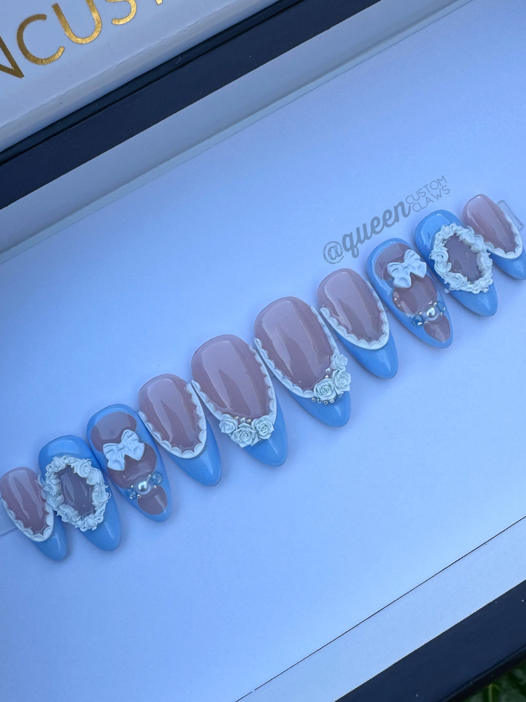 Sip in style with our Tea for Two nail set, inspired by the timeless elegance of Wedgwood porcelain. A soft blue base meets intricately sculpted 3D white accents, creating a refined, vintage charm perfect for afternoon teas or special occasions. Prefer a different hue? We can customize this design in any color you desire—ensuring each set is as unique as you are.