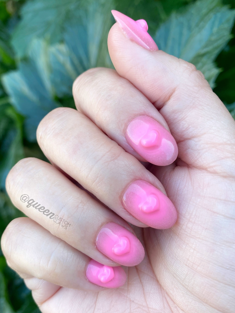 Introducing Love Bomb: your ticket to flaunt-worthy fingertips, featuring a stylish aura ombré look. Boast a baby boomer mani with a sweetheart center and a pink, glossy base. Choose from the clear heart, or the sprayed heart, default is clear heart over aura. Get kissed by Cupid with gorgeous French manicure vibes – no salon required!