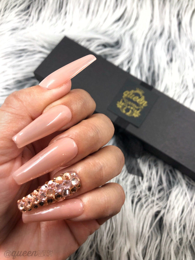 Beautifully natural looking slightly sheer & very shiny nude nails. Paired with peachy crystals, these nails look both natural and also a little special. Show out- not shout out with these glamorous and elegant nailsLOW GEM STOCK MEANS THE GEM LAYOUT WILL BE ORGANIC INSTEAD OF STRAIGHT ROWS. See alt images