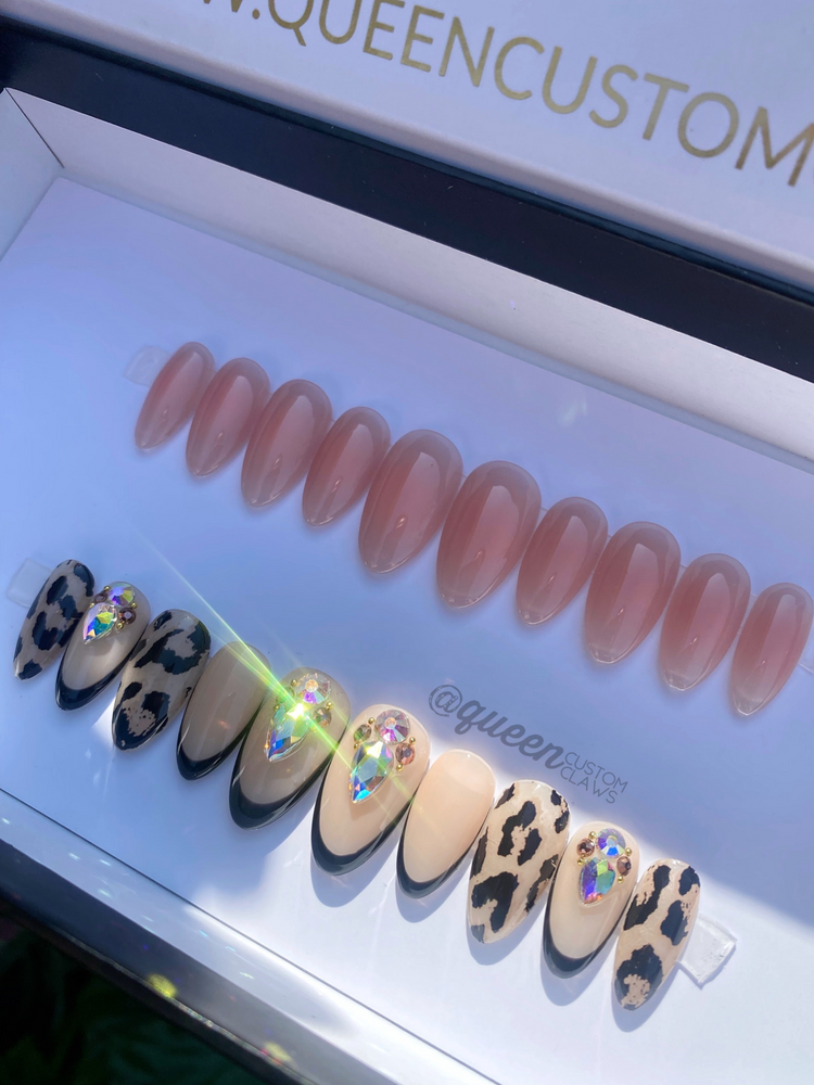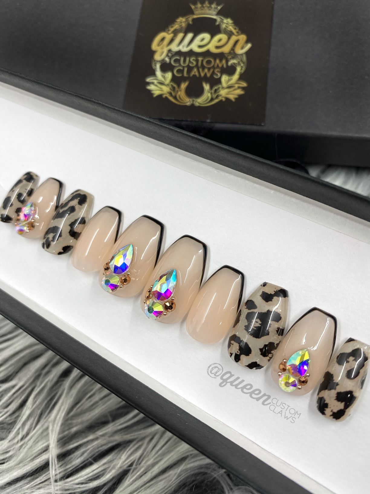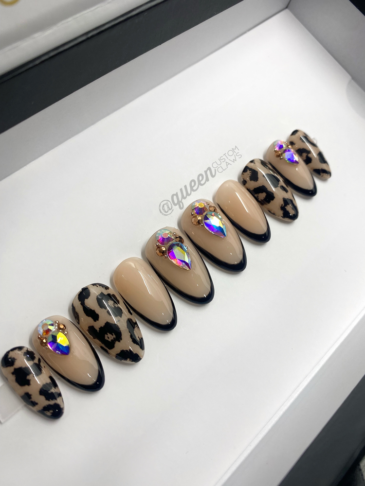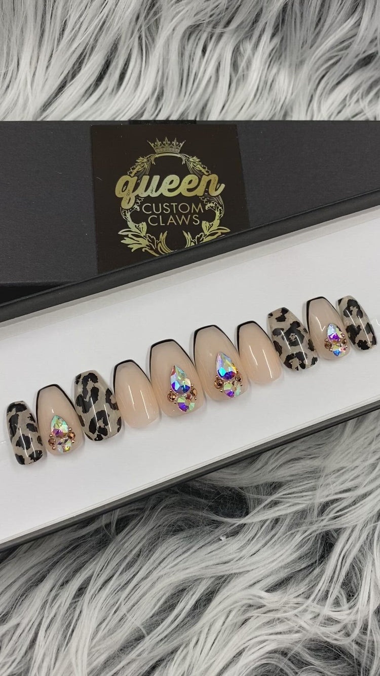 Meooowwww! Look at this sexy kitty animal print nail set. Sheer, nude, and leopard. Black tipped nails with luxe crystals in AB and rose gold make this set unique and classy. Just enough edge & still classy and sexy. This set is is made in lovely subtly sheer neutral color sure to enhance all completions! Beautiful softer alternative to a traditional Leopard print manicure.