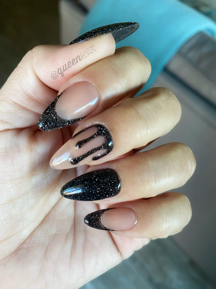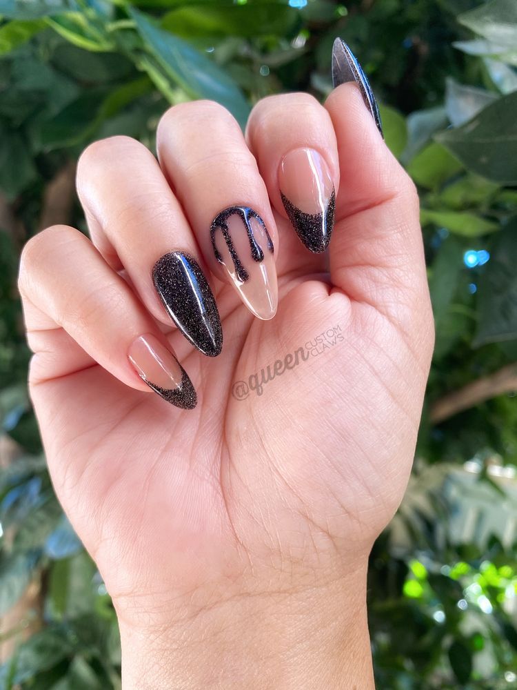 Sexy French 3D sparkle tips.     A sexy take on a decedent drip nail.  Black tips & drips at the cuticle and smile line, negative space subtle sheer jelly body.